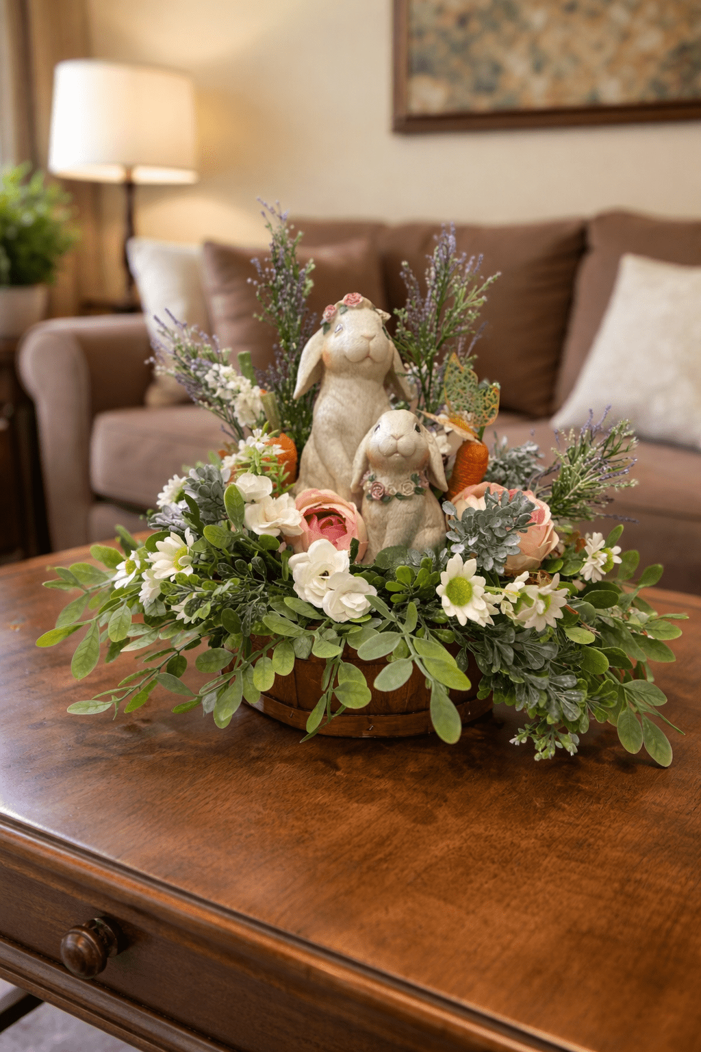 This Easter bunny floral centerpiece adds a soft and welcoming touch to spring and Easter decorating. Designed with gentle florals, greenery, and charming details, it works beautifully on dining tables, entryways, or coffee tables.