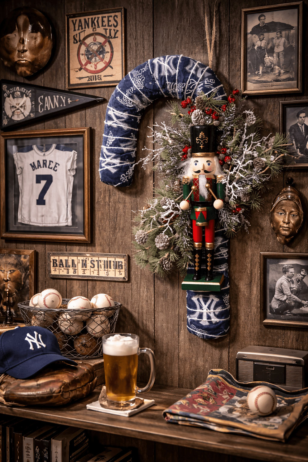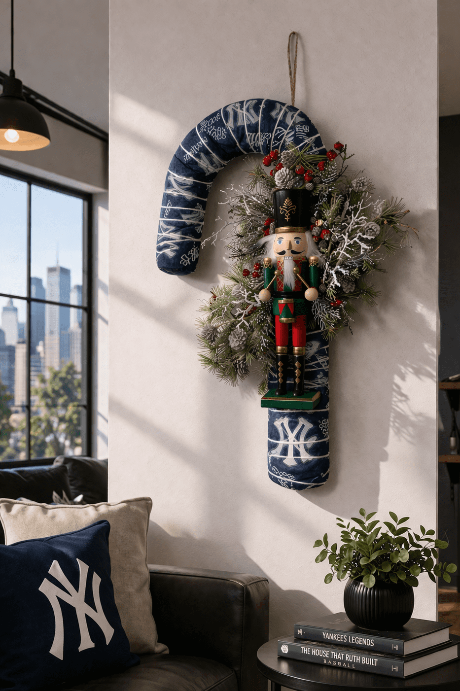 Score big with this one-of-a-kind NY Yankee Candy Cane Wreath! Designed for the serious fan, this wreath makes a statement all year round, whether it’s hanging in your man cave, game room, or favorite spot in the house. Crafted with premium materials, it’s a showpiece that combines team pride with festive cheer – minus the seasonal limitations.
